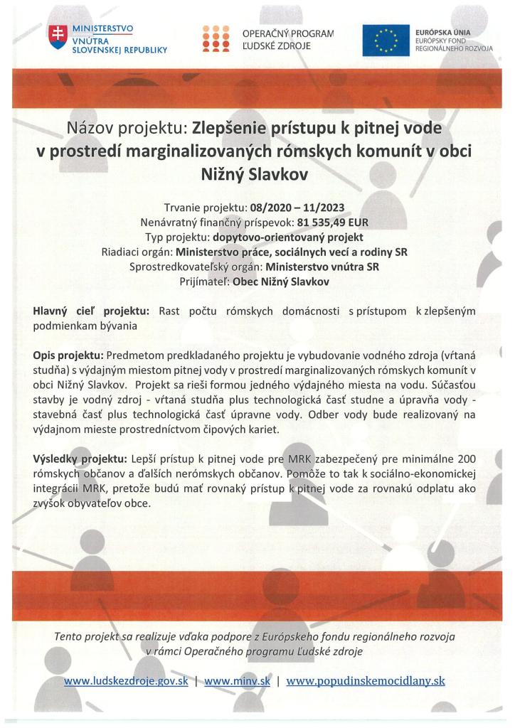 Predmetom projektu je vybudovanie vodného zdroja - studne s výdajným miestom pitnej vody v MRK v obci Nižný Slavkov.